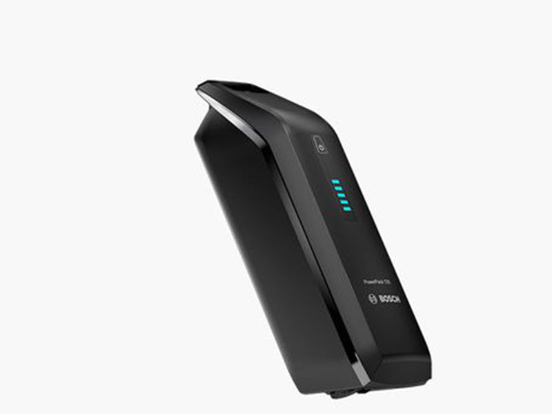 The Bosch Battery is locked into place and can be charged on or, by using the key, off the bike.